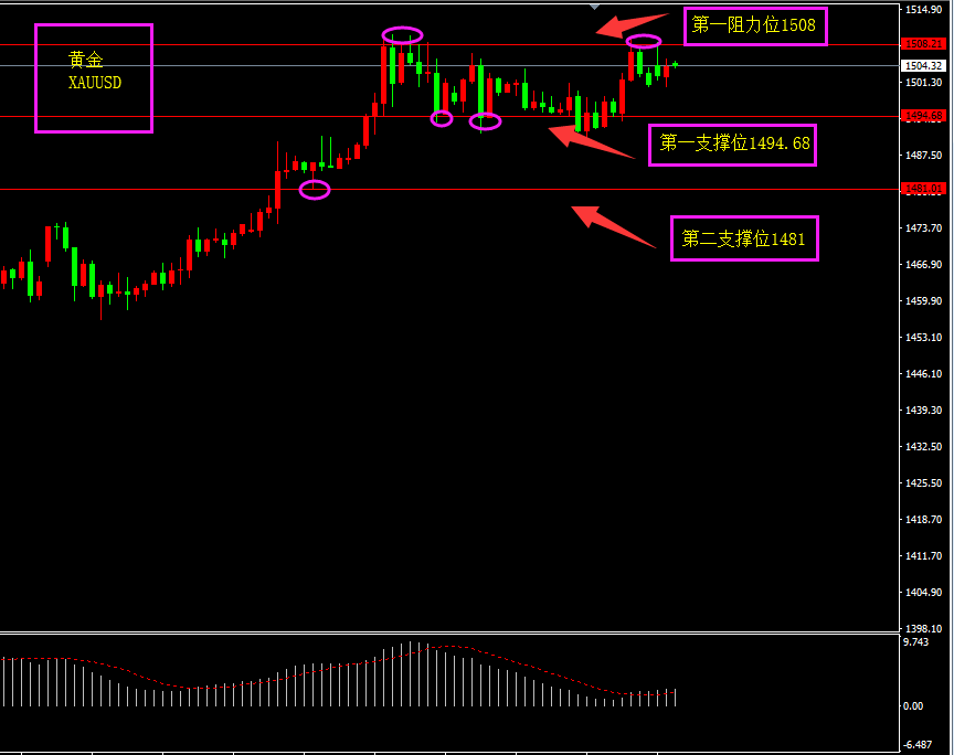 趋势分析:美指近两日底部回调对黄金有所打压,但黄金仍然保持着上行通道,全球经济放缓此乃主因,贸易局势恶化此乃近况,黄金将检验1500是否站稳?
