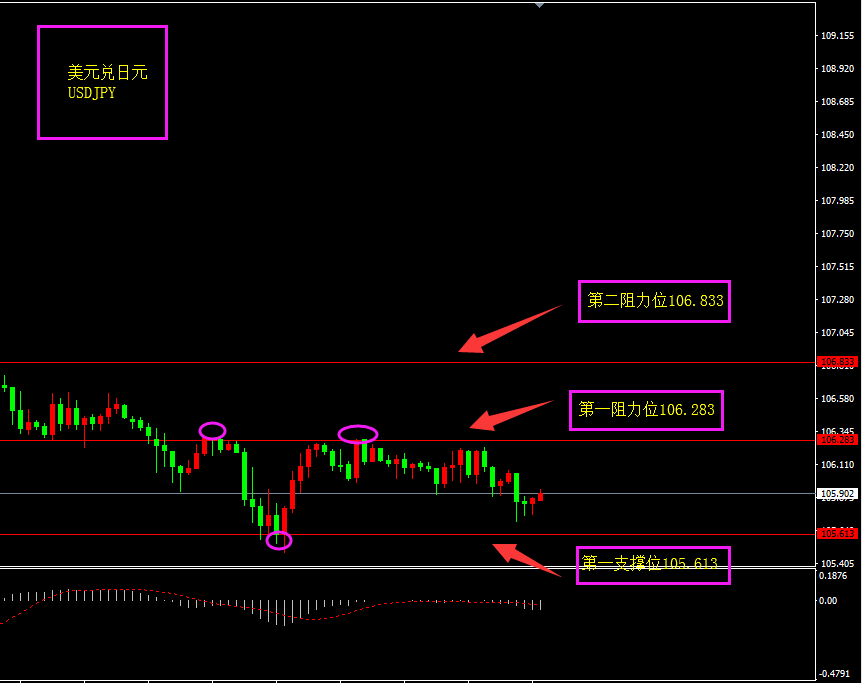 趋势分析:近几日美指在低位震荡,美日随着美指的强弱变化而变化,此外避险属性的强弱也影响美日的走势。
