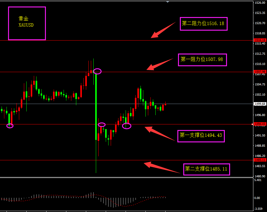 技术点评:天图黄金大方向保持看空,昨日三国利率持平,黄金短期维稳,底部1485位置支撑未破,短期形成高位震荡,随着美指的进一步回落,日内更多看好震荡以及震荡上行为主。小时图黄金昨日连续以小阳线上涨,底部MACD逐渐转移至0轴之上,多头小幅占优,但需注意上方大阴线开盘价位置(强阻力位),如有大阳线突破,则顺势回调做多,未破则更多出现回落。